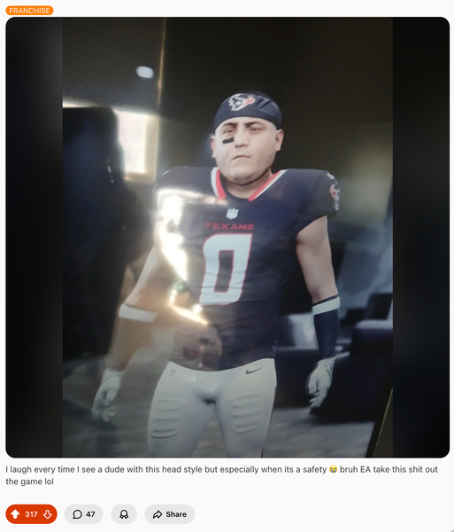 -Generic faces: They NEED to go. I was messing around making a draft class and I exited after 5-6 players. Half of the faces are unusable due to them improperly fitting in helmet or being a straight up eye sore. I feel as if many people made comments about how poor the hairstyles are on the generic face in recent years. instead of fixing them or making new ones, they just put caps on half of them. Easy and lazy way out in my opinion. My SUGGESTION, get the CFB faces into Madden. It's been recently brought to my attention by a content creator on X that the system in Madden and CFB as far as the generic faces are different. However, make new faces at least. Or actually take the time to rework the same CFB system into Madden. While not being able to create a player in CFB sucks, when editing and customization generic recruits I rarely see players with the same face which adds a huge depth of authenticity that Madden has never had. Im aware that there are thousands of generic faces in CFB but to replace the 200 in Madden with refreshed ones would be a much needed change that has been ignored for a decade. I genuinely do not understand how the devs are proud and happy putting that out in each product each year. Every sports game EA included has a face builder of some sort. Not even asking for that much.