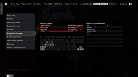 - All buttons listed under the heading "Advanced Defensive Engaged" (except R) are not doing what is described there. I've never managed to do any of these pass rush moves, nor swat the ball.