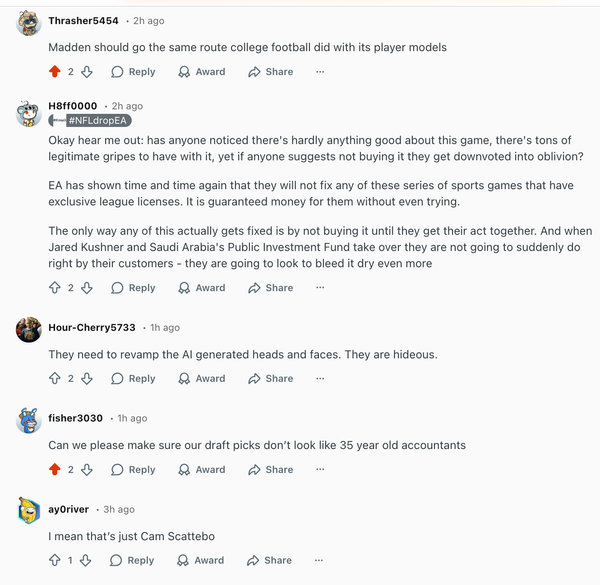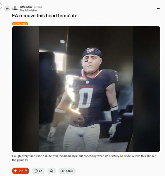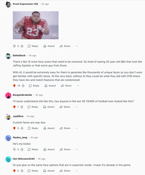 Biggest immersion breaker for Franchise now - generated draft faces. Right now we still get 21-year-old rookies who look 38, repeated preset faces across draft classes, heavy beard shading that ages players instantly, and identical silhouettes across positions, which makes long-term franchises feel full of clones. No matter how deep contracts, coaching systems, or presentation get, it doesn’t matter if the future face of your franchise looks unrealistic and generic. EA College Football already models youthful 18–22 year old players with better facial variety, and Superstar mode has a deeper face editor, so the tech foundation clearly exists within EA’s ecosystem. Franchise players aren’t asking for just 30 more presets — we’re asking for age-aware rookie faces, youth-specific facial structures, smarter generation logic with no duplicate faces per draft class, better skin and beard scaling by age, more body diversity tied to position, and the ability to edit generated rookies more meaningfully so the community can build immersive draft classes. If Madden truly wants to elevate Franchise mode, player identity has to be treated as a core pillar, not cosmetic padding, because without believable players the league never feels authentic.