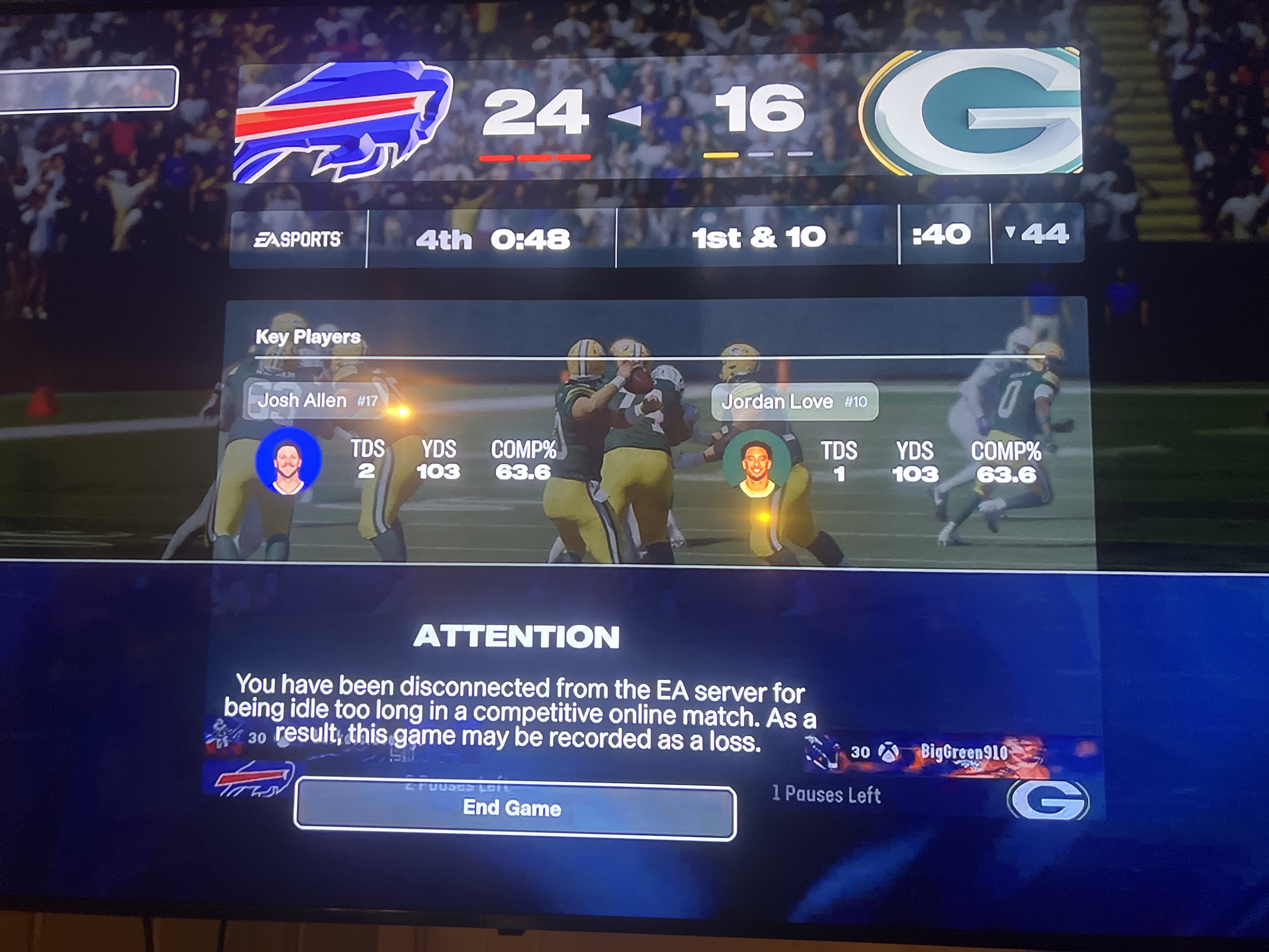 After throwing game ending pic, top 100 player paused game. I received a DC notice and then brought to main menu. As of now it doesn’t show a loss or anything but I recorded the ending that shows the score and then the DC notice.