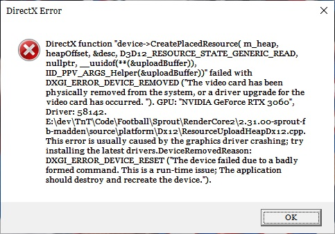 Regardless, after all of the prescribed steps the crash still occurred within moments after the opening kick off in a franchise game. This is with all settings maxed at 4k with Ray Tracing Ambient Occlusion enabled, and most importantly no limit on FPS. NOTE: this is not required to trigger the crash, but it is what accelerates the crash behavior to save time for testing. Otherwise with lesser settings it takes time for the crash to occur and it occurs at random making it hard to test.