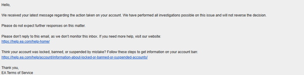 I was banned for "Coin distribution," which I obviously have not done. I obviously appealed close to a month ago now and have patiently waited for responses as I'm pretty sure I was banned from EAs bot as many others have been. Now, 5+ appeals later, I don't understand how that is fair when I was banned for no reason. This happened to me on Madden 21 years ago, and months after they finally unbanned the account. This account I had 70M coins and 1k hours played, and it's just all gone because of a bot. I guess as I've asked for details on the ban and they have told me they cannot go into details. Which again makes absolutely no sense to me at all. What am I supposed to do? There is nobody I can get in contact with?