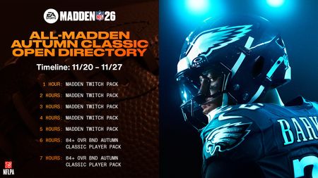 NatureBoy2323Hero+4 months agoThe Autumn Classic Open Directory The Autumn Classic Open Directory is officially LIVE! Connect your EA & Twitch accounts to earn rewards all week long just by watching your favorite Madden NFL 26 streamers. Show More