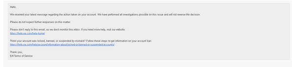 My account was suspended on November 21, 2025 for "Coin distribution" in which I have never bought or sold coins. I had over 1000+ hours on madden 26 with over 70M coins from working the auction house. I have put in around 10-25 appeals regarding this and asking EA to please look at it seriously. I have made many EA support chats and talked with agents in which they tell me to just go through the process with the TOS team in which I have every time I get the same response saying they have looked over it and feel the ban is justified. I know for a fact the ban cannot be justified and I have seen so many other people within the community with the same problems. I just do not understand how im not able to talk to someone about this problem i have. I cant even talk with the TOS team as they say they are not showing my any evidence regarding the suspension. Today I received this email saying they are never looking at it again basically telling me to stop appealing. How can that make any sense for someone that buys ones product and spends their time on it to basically say we don't want to help you stop appealing? If anybody at EA or with EA connections happens to see this I would really like to talk about this but im sure nothing will be done about this sadly. I went through the same thing in madden 21 and randomly months later was unbanned.