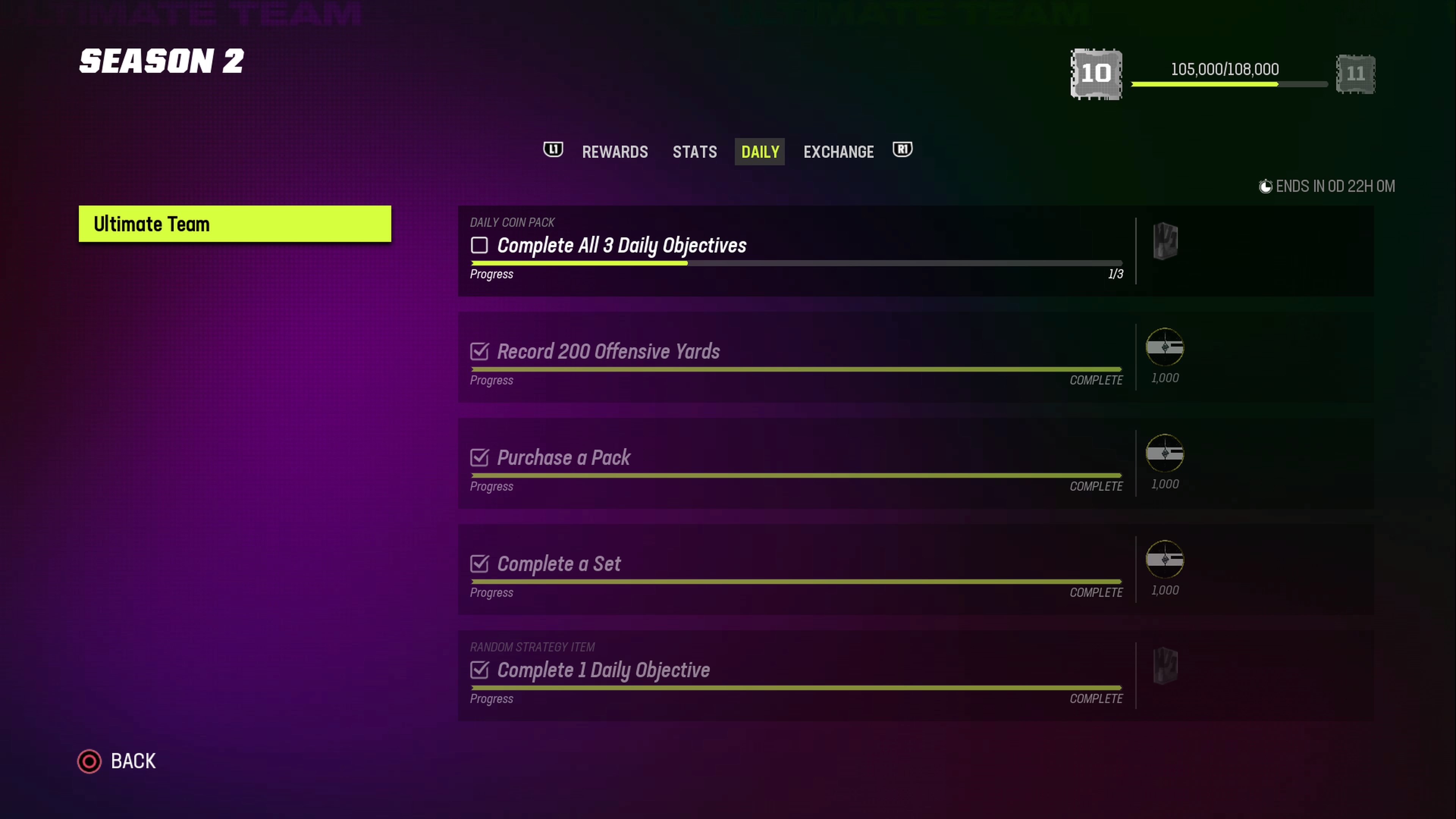 I know that a lot of people have talked about not receiving credit for the daily objectives, I just wanted to throw my 2 cents in and say that it is SPECIFICALLY the yards and completing a set that do not track. If you do either of these two objectives you do not receive credit for the "complete 1 daily objective" strategy item. The only one that correctly tracks is "purchase a pack". That being said, it is kind of disheartening because i've completed them every day in hopes that we will be credited with the stats once it's fixed but i'm missing out on the tens of thousands of season XP and the daily coins and it makes me feel like I wont even have a shot at the 94 Primetime card this season that I was extremely excited about