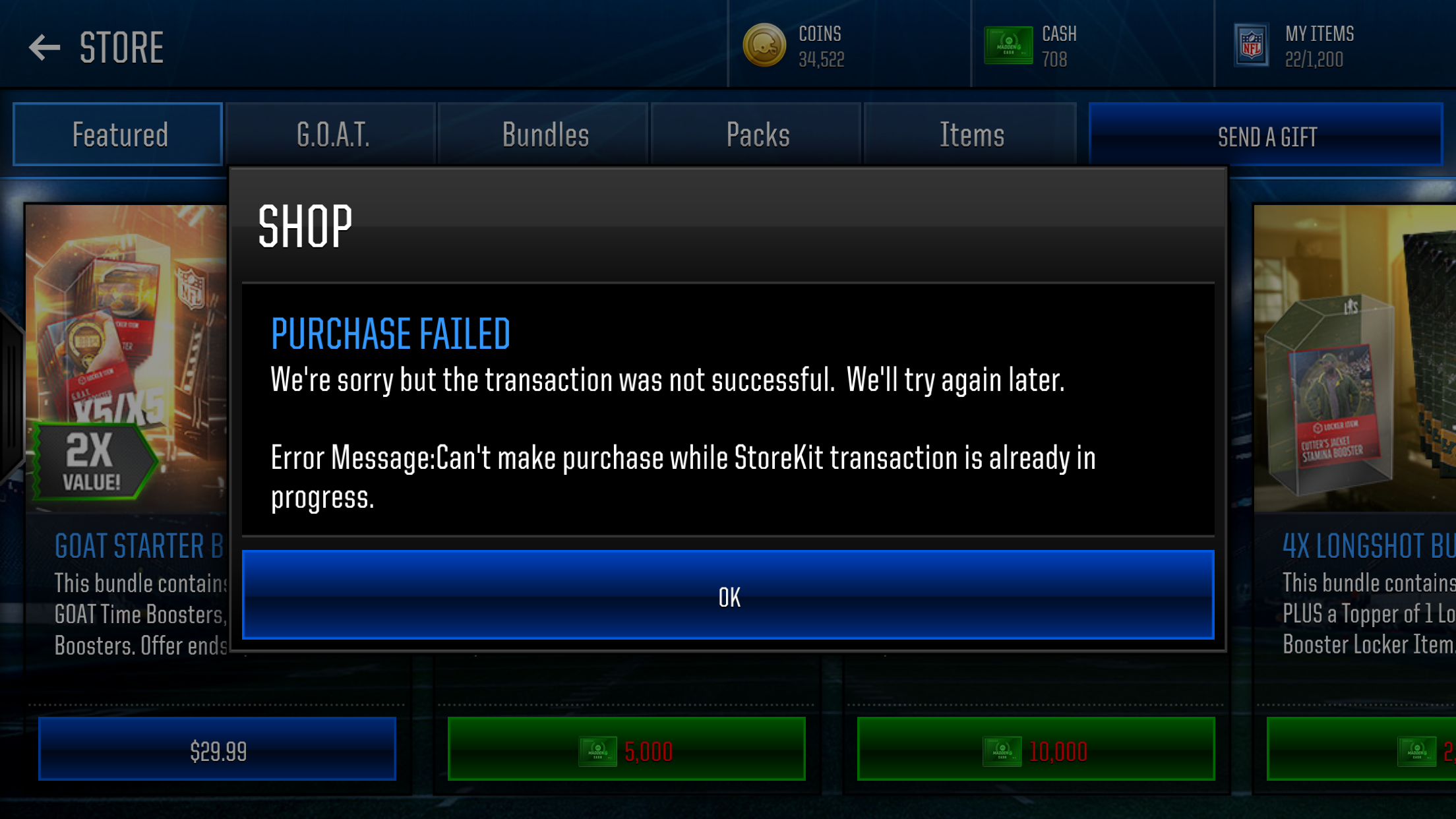 Same error message as the rest. StoreKit purchase has not been completed. Trying to purchase the "Madden Special" at $9.99. I've made other attempts at other items and wasn't able to. This has been ongoing for almost a week. - Anonymous8 years agoI've had the same exact issue as well, it's been on going for the last two days. I'll get the same error message unfortunately.