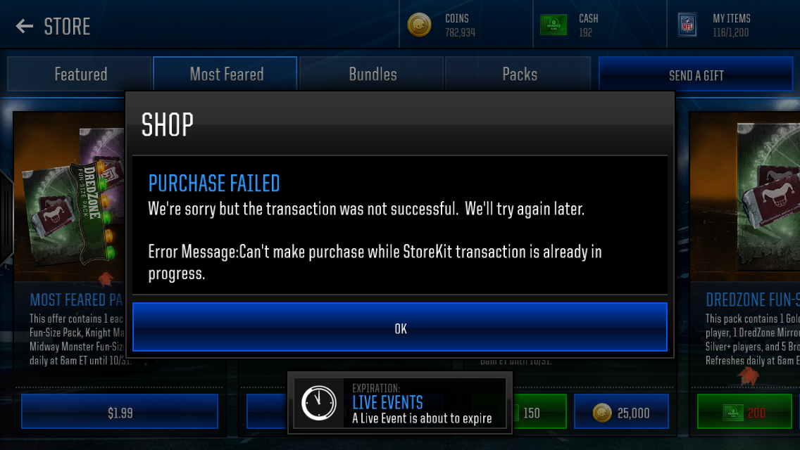 Can't purchase madden cash. Says something about Storekit transaction is already in progress. Was working fine last week and now this week I can't purchase. Anyone know what to do? I tried contacting EA but can't get the live chat to work