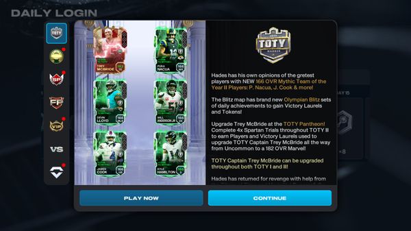 NatureBoy2323Hero+1 day agoMadden Mobile 26 Team Of The Year Part IIEnjoy the views from to the top of Olympus in TOTY Part 2! Face daily rotating Godly Trial Achievements for more Victory Laurels and conquer Hades' Challenge.