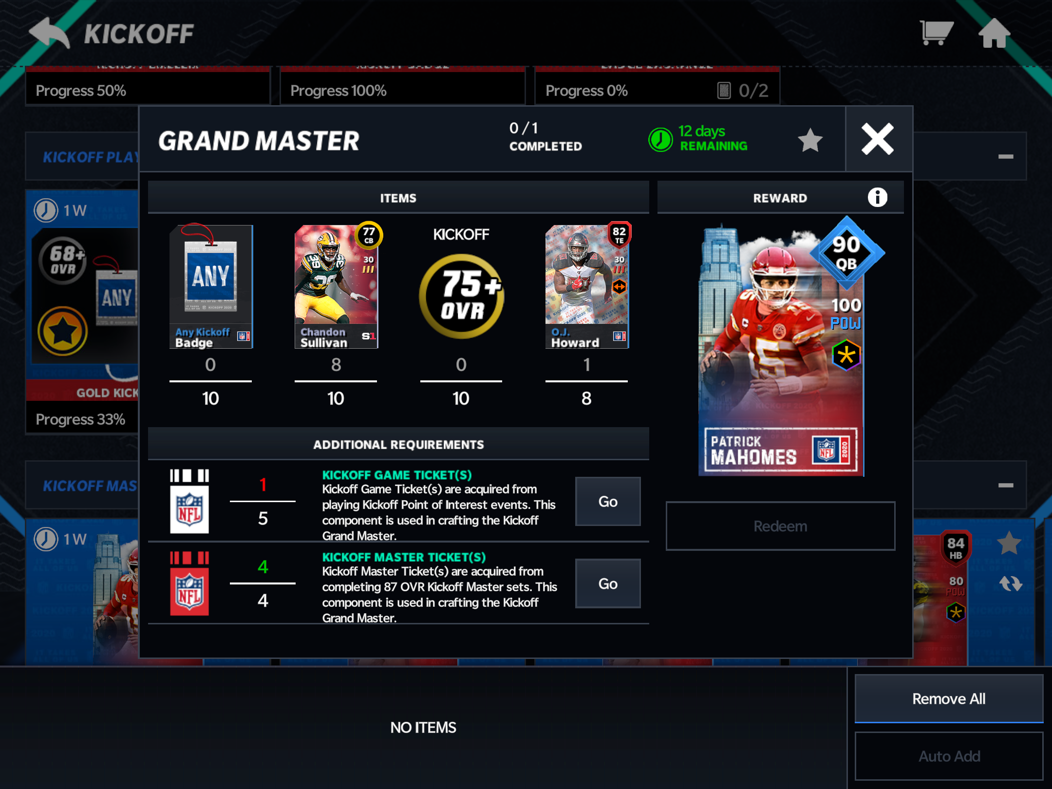 I have the exact same problem. On day one I completed just 2, 87 overall Kickoff Masters (Brown & Wright) but for some reason when I checked the Mahomes Grand Master set, it showed that I had the required 4 Master Tickets. About an hour later I randomly went to the Grand Master set again and my Master Tickets had been reset to zero. That’s when I emailed EA Help. Later that day an in game notification popped up and corrected the visual glitch. It displayed correctly that I had 2 Master Tickets. At that point I thought everything was fine. However, yesterday I completed 2 more 87 Kickoff Masters but for some reason it still shows that I have just 2 Master Tickets. I contacted EA Help and they said that they’d report it and that it should fixed in the next few days. Not sure that’ll happen but who knows this season.