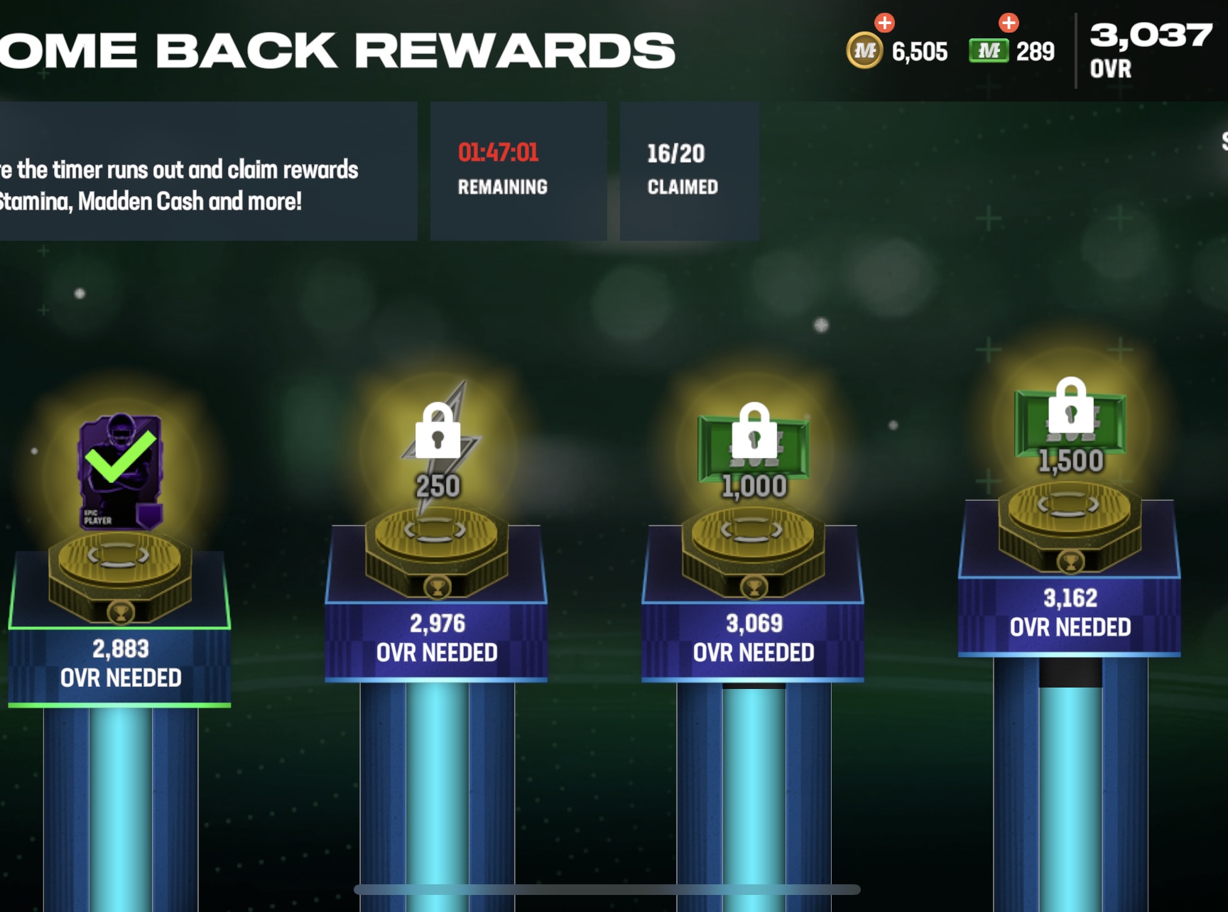 Welcome back reward is not triggering in madden mobile 25, specifically the epic player at overall 2474. My overall is a 2498 and it will not let me claim.