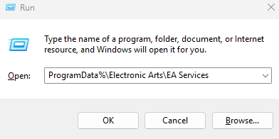 • Type or copy and paste "ProgramData%\Electronic Arts\EA Services" (without the quotes) into the new Window > ENTER
