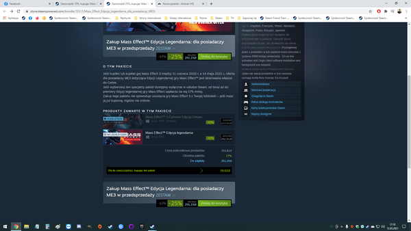 Kuba na steamie pojawiła się specjalna oferta dla posiadaczy Mass Effect 3. Niestety to wygląda na dużą pomyłkę. Podeślę Ci 2 screeny. Zareaguj proszę w tej sprawie 😉 Za normalną wersję zapłacę: 242,91zł a za MASS EFFECT™ EDYCJA LEGENDARNA: DLA POSIADACZY ME3 - 291,19zł