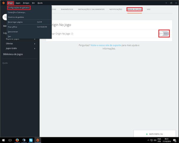 - Desative o Origin no jogo, para fazer isso vá no menu Origin > Configurações do aplicativo > Origin no jogo. Desmarque a opção "Ativar Origin no jogo" (deixe exatamente como na imagem abaixo).
