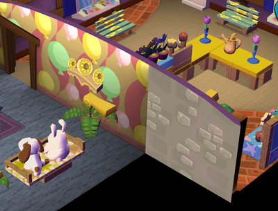 Also, some walls, (such as one in the flower shop), cannot have its wallpaper changed since its "outside" the building, (this just isn't visually appealing). - It would be nice to have a "view in room" when building new items.