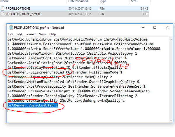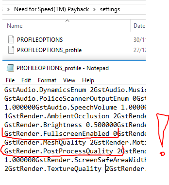 W katalogu ustawień gry Dokumenty (%USERPROFILE%\Dokumenty lub %USERPROFILE%\Moje dokumenty) > Need For Speed(TM) Payback\settings, otwórz plik PROFILEOPTIONS_profile w Notatniku i zmień wartość jak poniżej - GstRender.PostProcessQuality 2 i GstRender.FullscreenEnabled 0