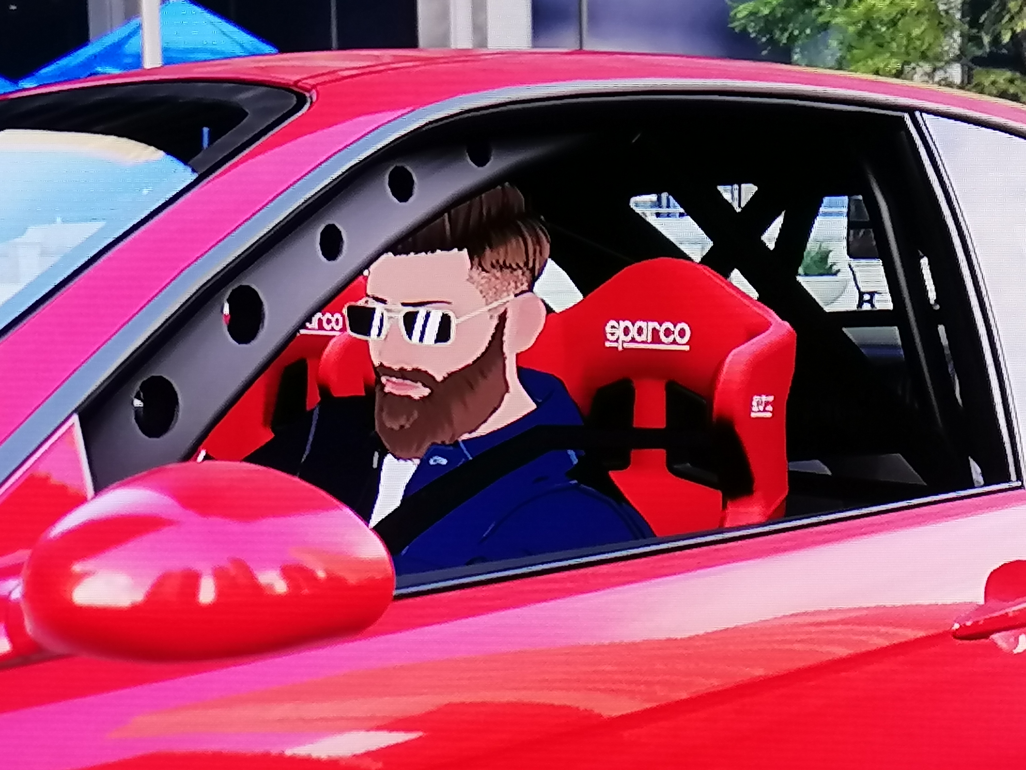 Next time you'll race with it, think about how our characters completely rolls down the window to taunt the other racer at the beginning of the race. It shouldn't be possible to roll down the window because it doesn't have the mechanism to do so since this is a race-car and removing parts and useless mechanism is part of the process for weight reduction in a race-car. That's why it has a slide window instead. Yet the window rolls down.