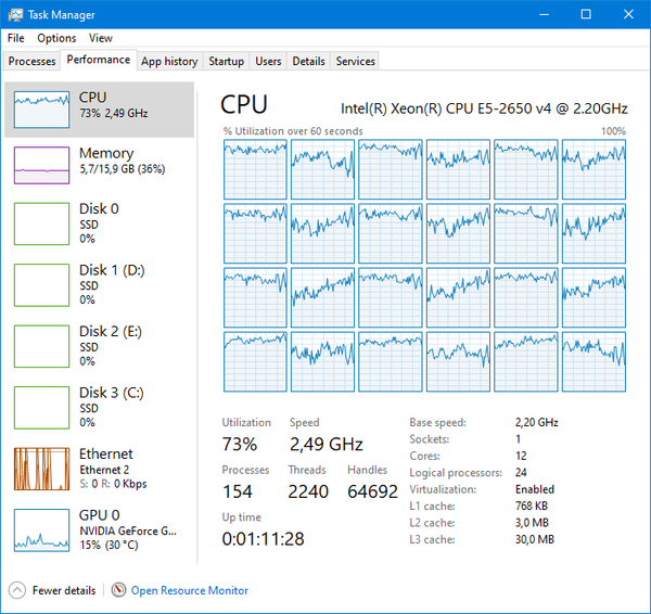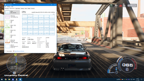 This screenshot show all the CPU cores in use at half speed and the GPU being used at 9%.