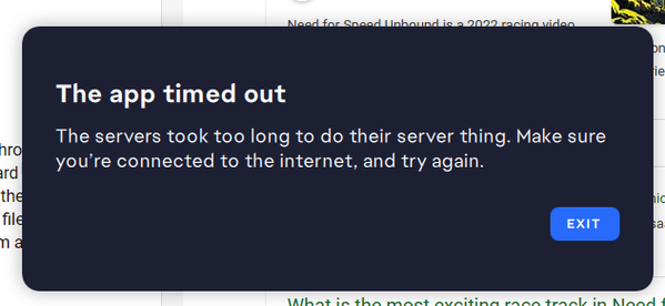 When I open the NFS UNBOUND OR Need for speed Deluxe edition it gives me error "The EA app encountered an unknown error. Try again a bit later" and intermittently it shows "The servers took too long to do their server thing. Make sure you are connected to the internet, and try again"