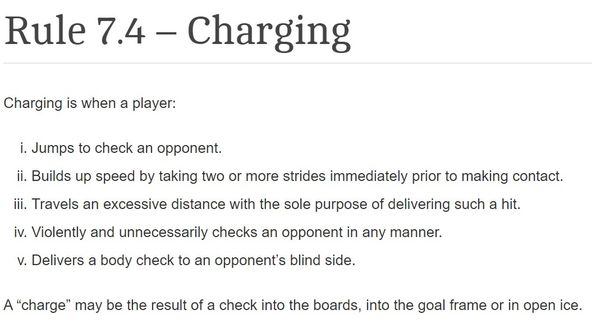 - couture2fat2fly2 years agoSeasoned Veteran@Dalytrev What Aljo says is actually incorrect. Skating for too long before hitting, without slowing down is why you take charging penalties. You can stand still or glide and charge your hits as long as you like. The main thing is if you have been skating more than a few strides, you need to release the left stick (i.e. glide) before you hit someone. That part is actually a real rule, see 7.4.ii from the comment above.
