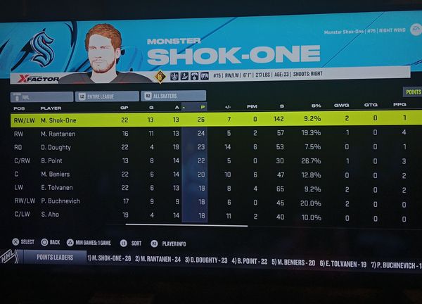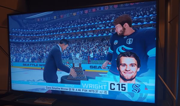Also, if I look at the "stats" during the playoffs, the stats are displayed correctly on that screen. But during a game when it shows League or Team leaders it shows Shane Wright with his 62+ points. And after finals are over it awards him the Conn Smythe.