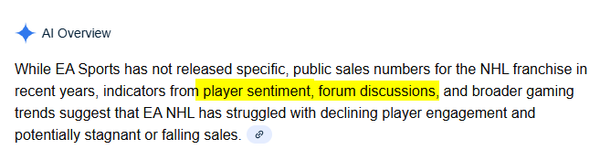 I also think there’s a tendency for players to assume hockey IQ alone should carry them. When that knowledge doesn’t fully translate into thumbstick skill, positioning, or timing, the blame often shifts to the game instead of the learning curve. That doesn’t mean all criticism is invalid (far from it) but it does complicate the idea that fixing a handful of “small things” would suddenly reverse the direction of the entire franchise.