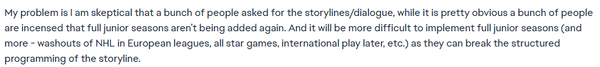 My problem is I am skeptical that a bunch of people asked for the storylines/dialogue, while it is pretty obvious a bunch of people are incensed that full junior seasons aren’t being added again. And it will be more difficult to implement full junior seasons (and more - washouts of NHL in European leagues, all star games, international play later, etc.) as they can break the structured programming of the storyline.