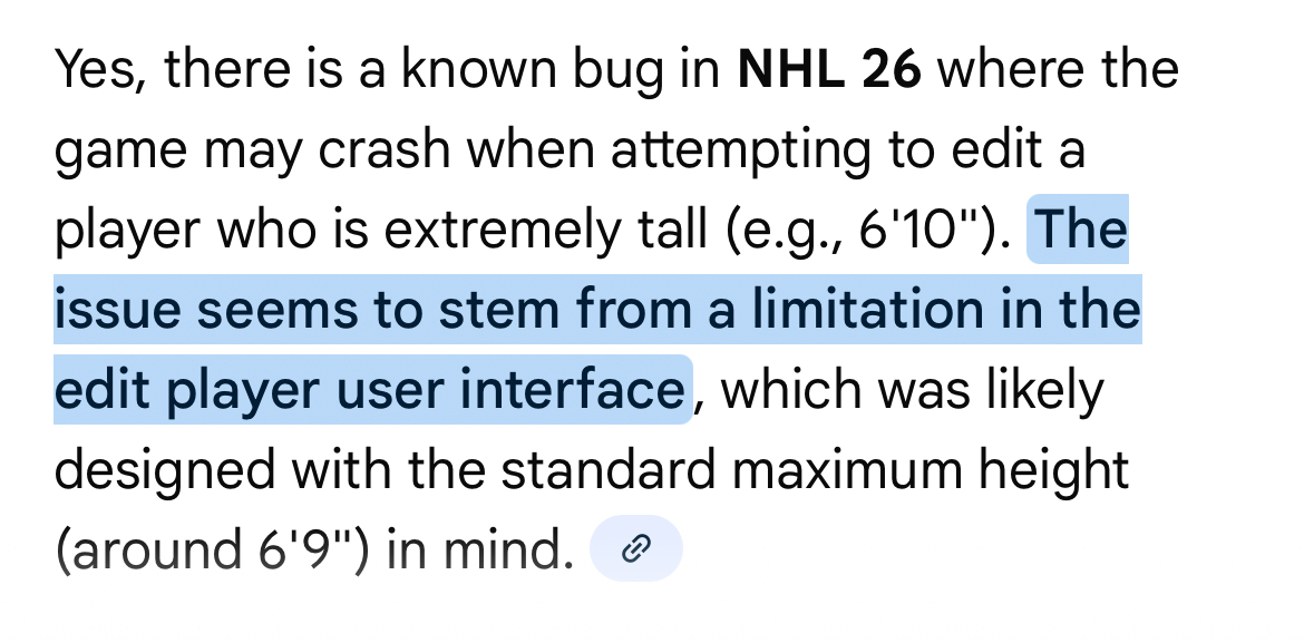 NHL 26 crashing when editing a 6’10” player. ( known issue )