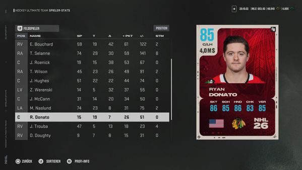 I've noticed that in HUT, the games played for players whose value has been increased through line combinations aren't counted. I only took three screenshots, but I have six players who always end up with the same game count, but the goals and assists are counted.