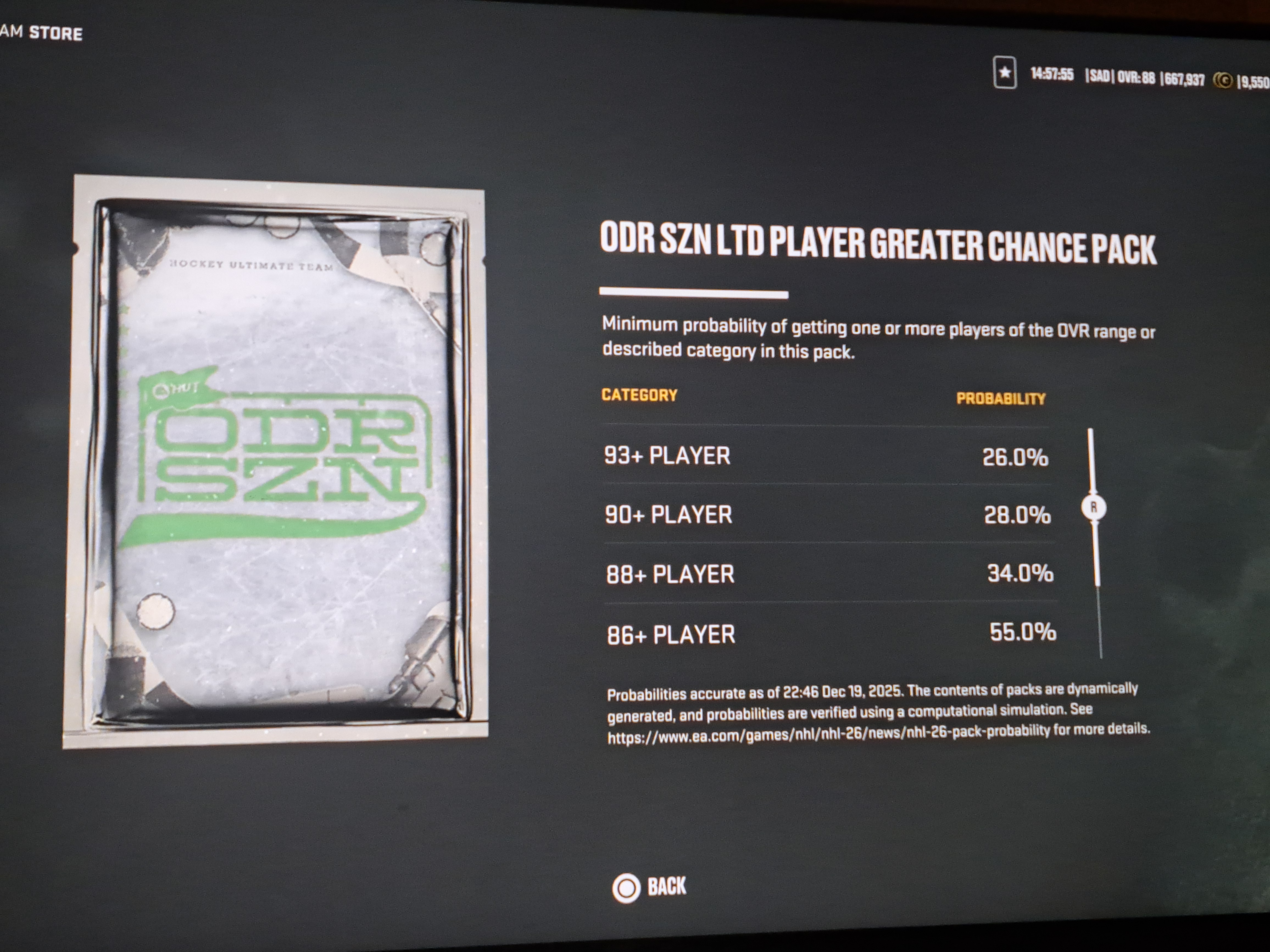Today I missed that there was a scroll bar on the side of the pack odds and that the only guaranteed 100% card was an 82 plus. For $50 this seems like an absurd concept to me, but I share this as a public service message only so that others perhaps do not try to have a little fun and get made to look and feel foolish this holiday season.