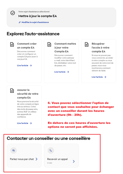 Je me suis fais bloqué mon compte et je ne savais pas pourquoi mais la je viens de me rendre compte que l'adresse email lié au compte n'est plus la mienne.. j'essaye de parler a un conseiller et je ne trouve pas l'option chat ou recevoir une appel.. tout ce quil me demande quand je vais dans contactez nous, c'est d'expliquer mon problème et quand je pèse sur envoyer j'ai juste l'option de forum ou auto assistance.. j'veux jouer a mon jeu esti!!🤬😮💨