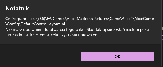 Podczas gry w Alice: Madness Returns napotkałem problemy z niektórymi funkcjami w grze np. określone klawisze nie działają, co wynika z błędów w plikach konfiguracyjnych.
