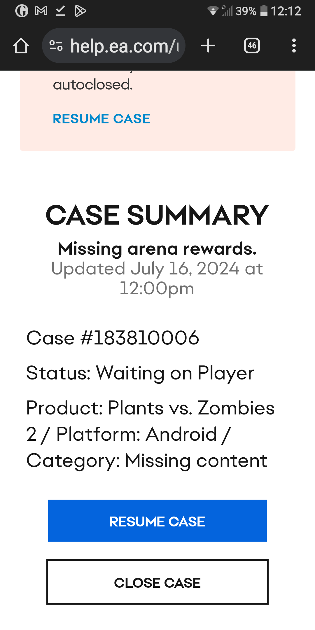 If i go to the manage cases, the 'awaiting response from player' window is highlighted as EA wants me to 'resume case'.