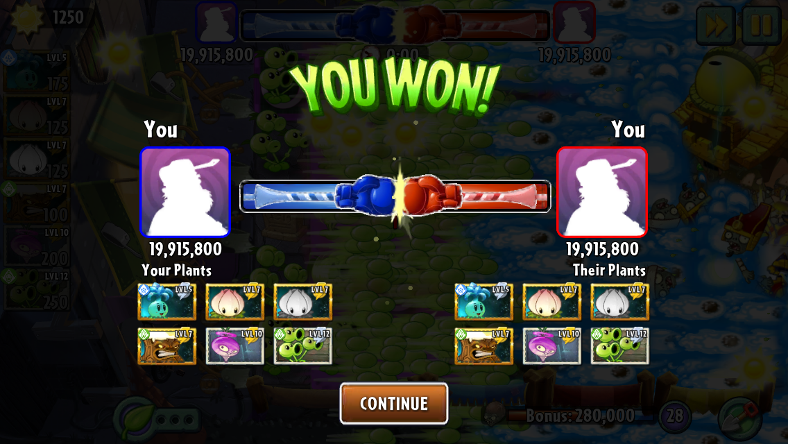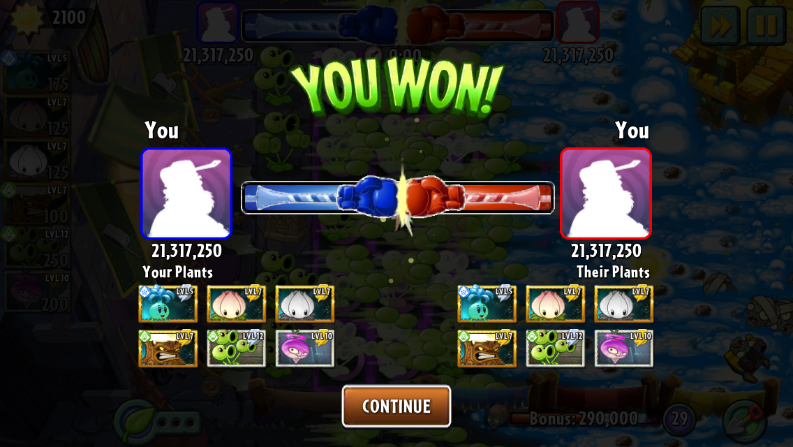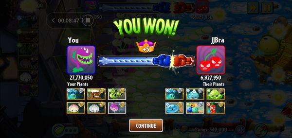 @HenryThePear I'm about to have my next free play and I'm on the third match. I'll test a load-out for you then. Do you finally have all world plants? :-P And do you have Pokra?