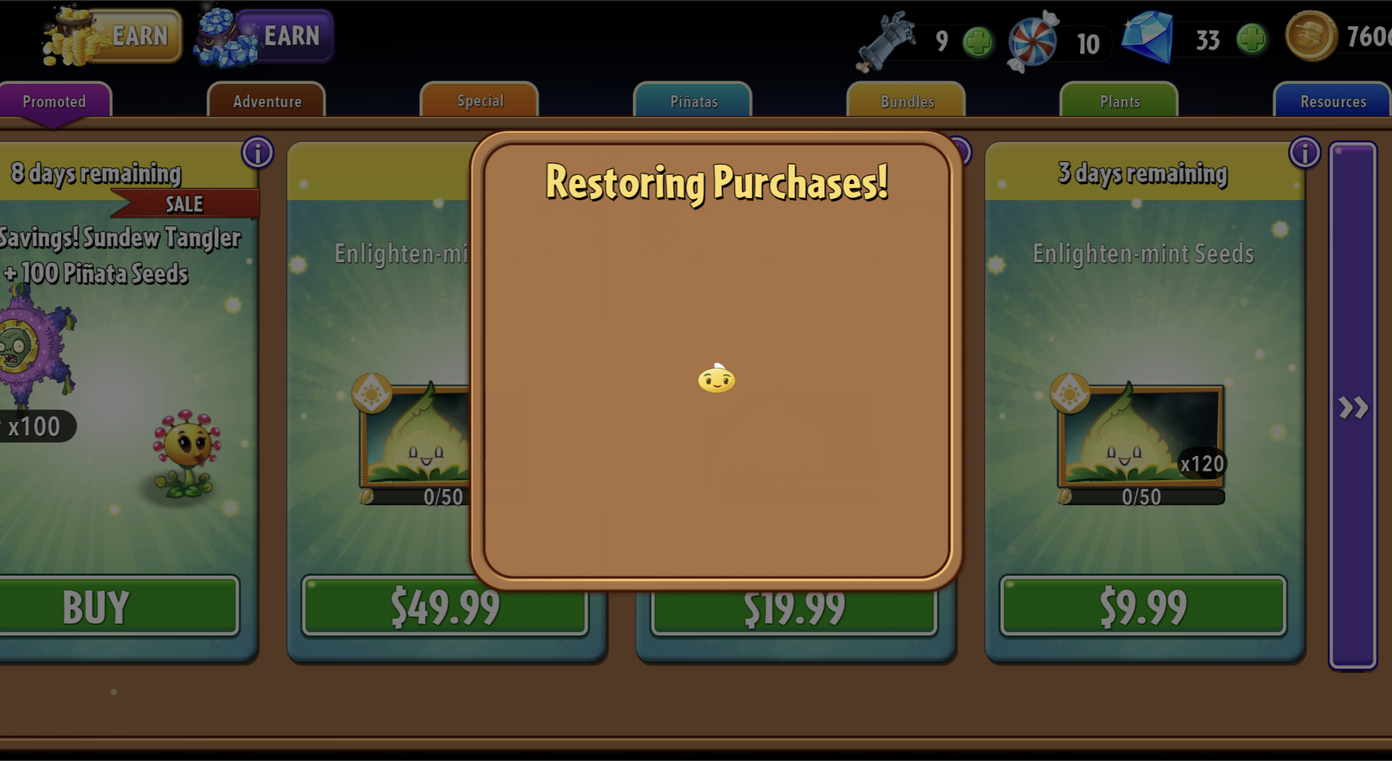 I have been unable to make purchases in Plants vs Zombies 2 for over a week. I get an error message that says "Unable to complete purchase. Please try again later." There is no error code number. My payment method seems to be correct.