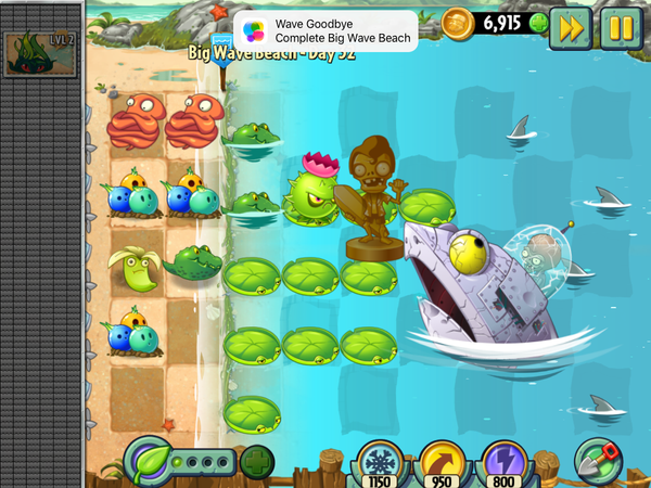 I'll just say here that I'm finding this week's tournament something of a mind-numbing bore. It takes me almost as long to set up my defenses, which consists of six columns of Primal Peashooters, one column of Cold Snapdragons, and two columns of Explodo-nuts, as it does to play the match. PLUS it then boils down to constant Blover spamming and little else. (Other than trying to ensure I don't get carried away and run out of Sun before the match ends.) Because of this I've only been playing enough matches to qualify for my six 'Free' gems.