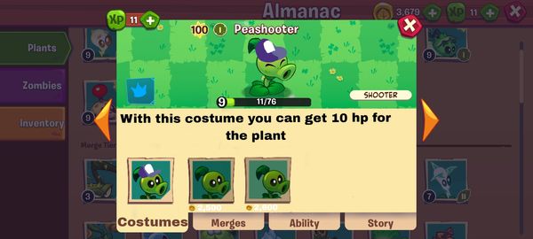 well this would be my idea for the costumes and how they would look in the almanac as we can see when you enter the almanac and touch a plant next to the plant a button with a crown would appear that when pressed would take us to this other section where the costumes of the plants would be shown and my idea would be that the costumes could be bought with