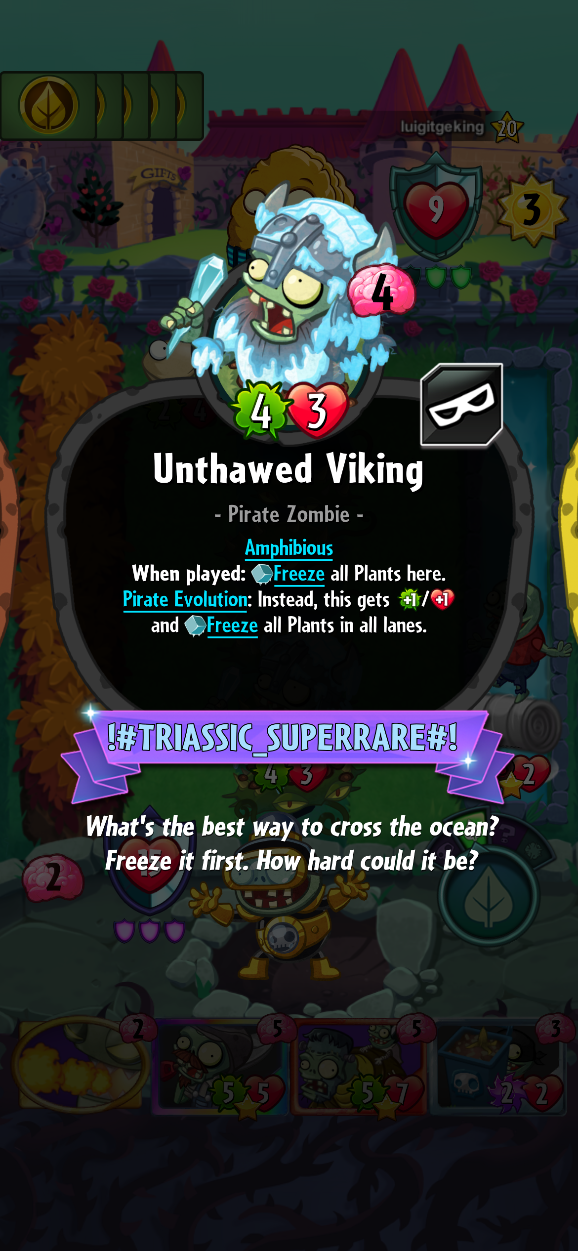 While playing the last fees days PvZ Heroes , I realised that the zombie card “Unthawed Viking” didn’t freeze “when played” any of the plants on its lane nor any other when used on a pirate evolution .