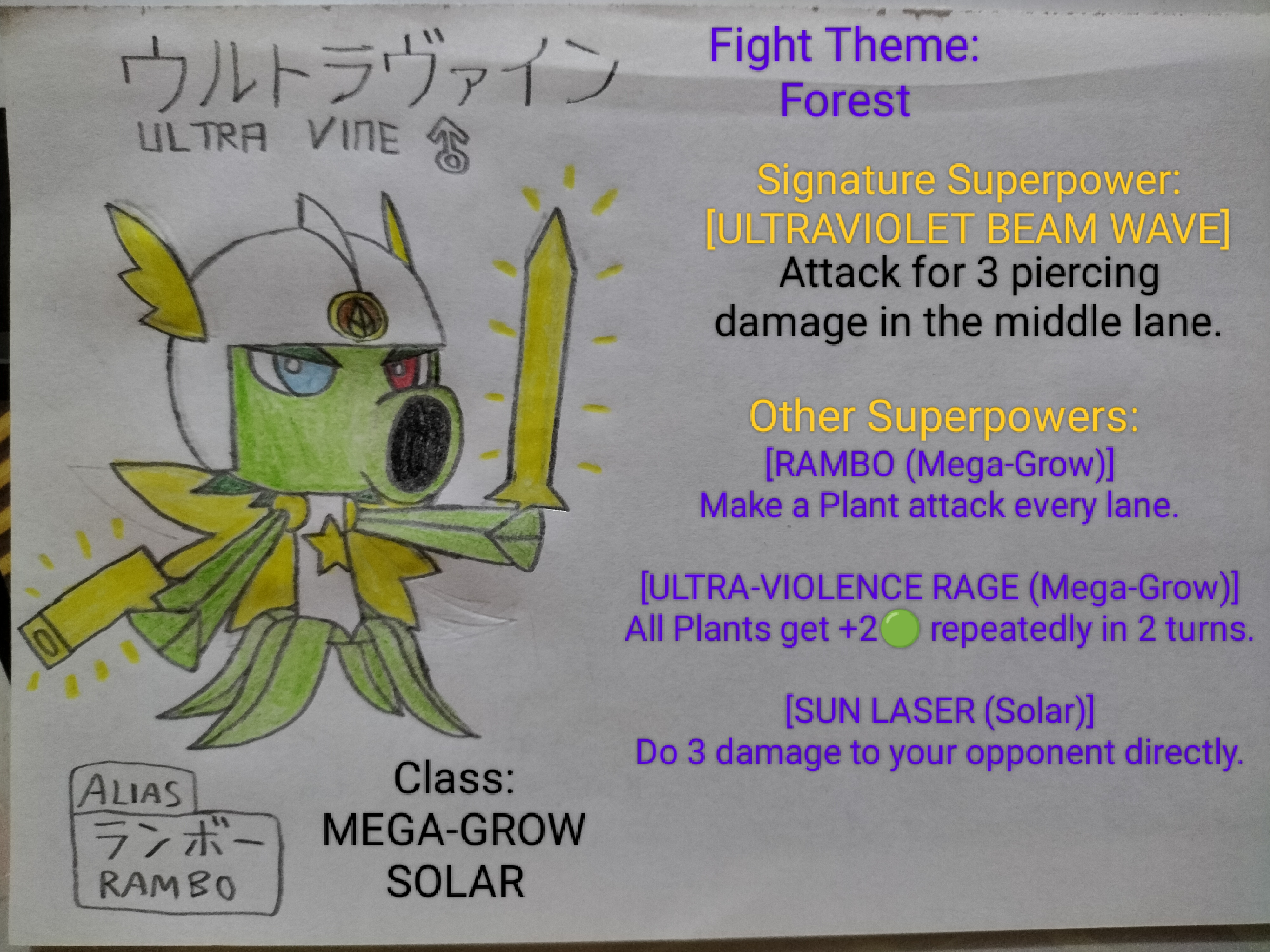 Thank you and by the way, Ultra Vine (alias Rambo) is a Male and he is a hero version of Repeater. His species is an Alien Plant Hero who doesn't have a home planet, instead he was crash-landed on Earth.