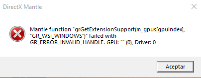 Mantle function "grGetExtensionSupport(m_gpus[gpuindex], "GR_WSI_WINDOWS")" failed with GR_ERROR_INVALID_HANDLE. GPU: "" (0), Driver: 0