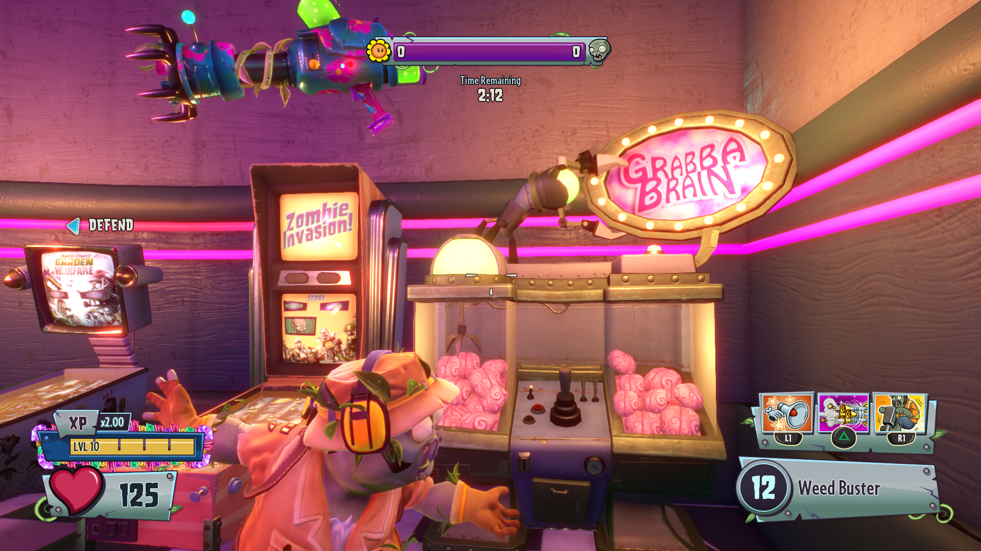 4. Once he dig, we back to top and build our protection there (healing flower pot, ice pot). We can attack all of the burgers from this position (pair on left and pair on right). One player focus on destroying burger while other doing bodyguard when needed.