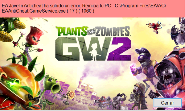compre pvz gw2, y desde que lo compre me sale el error "EA Javeogrlin Anticheat. Reinicia tu PC.: c:\Program Files\EA\AC\EAAntiCheat. GameService.exe ( 17 ) ( 1016 )" ya reinicie mi pc. no pasa nada, ayuda