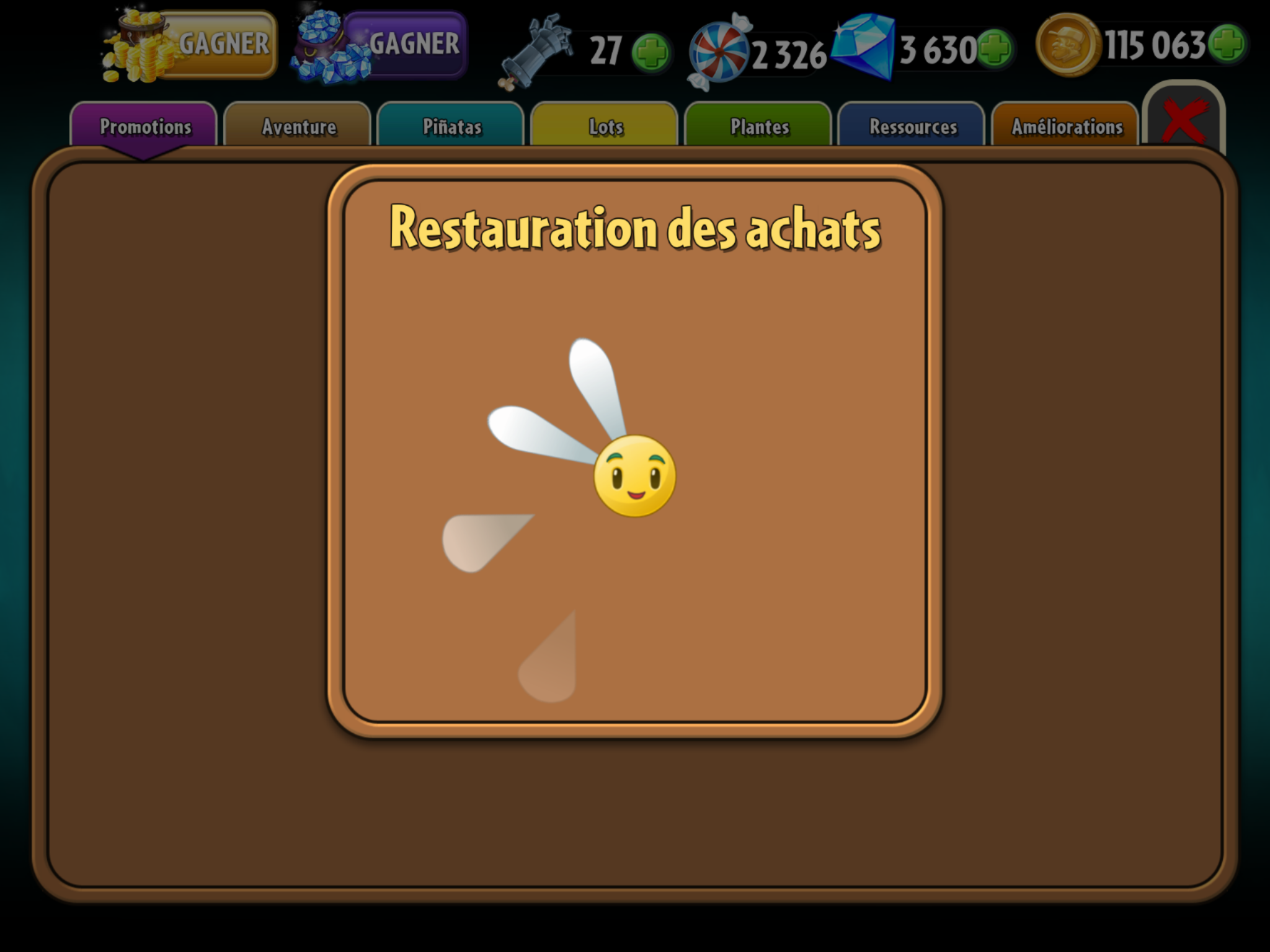Depuis quelques semaines je n'est plus accès à la rubrique achat dans plants vs zombies 2 ( tournesol dans un caddy en haut à droite de l'écran) : quand je vais dans la rubrique une page "restauration des achats" s'ouvre et reste bloqué dessus( voir capture d'écran jointe), plus aucun action n'est alors possible et je suis obligé de fermer et de réouvrir le jeu. J'ai tenté de désinstaller le jeu puis de le réinstallé mais rien n'y fait... Je sais que d'autre personne ont déjà envoyé ce problème.avwz vous une solution ?