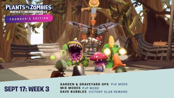 Salve, Vicino Fondatore! Benvenuto alla terza settimana di Notizie da Neighborville, la tua fonte di informazioni sui nuovi contenuti della settimana della Founder's Edition di Plants vs. Zombies™: La Battaglia di Neighborville. Come saprai, i Vicini Fondatori possono giocare a un'edizione in anteprima del gioco, ricevere ricompense e usufruire del prezzo speciale Founder di 29,99 €* prima che la Standard Edition diventi disponibile al prezzo di 39,99 €*. Maggiori dettagli disponibili qui! Non sei ancora diventato un Vicino Fondatore? Assicurati di ottenere il gioco prima che l'occasione termini il 30 settembre alle 18:00 CEST/09:00 PDT.