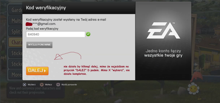 Oczywiście tak jak na zrzucie ekranu (może być słabo widoczne) najeżdżam na opcję ”DALEJ”, ale on nie reaguje na (X) na kontrolerze PS5 (tzn. nie reaguje na polecenie które ma wykonywać). Jak najbardziej mogę klawiaturką strzałkową (D-pad’em) najeżdżać na poszczególne przyciski w oknie, ale nie mogę faktycznie wybrać przycisku i kliknąć by (X) zadziałało dla przydzielonego ”wybierz”. Nawet „wyślij kod ponownie” działa, ale już nie „dalej”, przez co nic nie mogę zrobić.