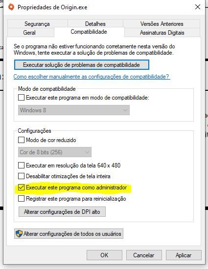 3) Siga ate a pasta de instalação do Origin (geralmente fica em C:\Program Files (x86)\Origin) e marque o aplicativo Origin.exe para rodar como administrador (Clique com botão direito do mouse em cima do ícone do app > escolha Propriedades > Compatibilidade > Executar esse programa como administrador > Clique em Aplicar)
