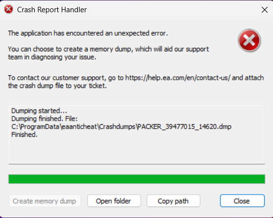 Вместо запуска игры открывается окошко с ошибкой Crash Report Handler и создается новый дамп