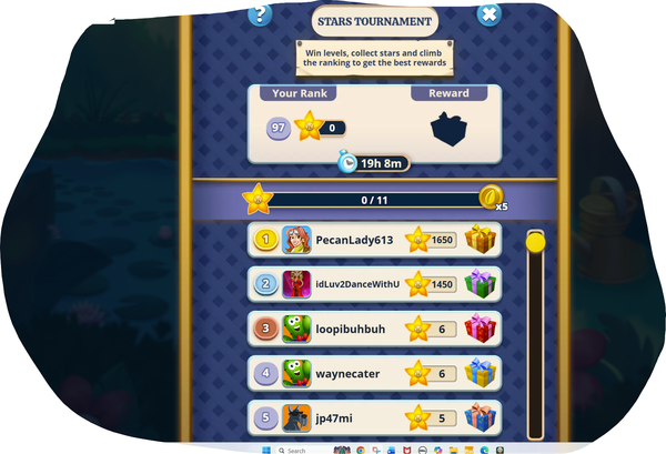Again, not possible. To get to 1650 even if you win the maximum of 3 stars you'd have to have played AND WON 550 games to be this far ahead and the new "tournament" only started several hours ago. So how does this happen?