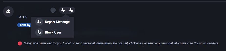 1. Reporting through Pogo email: You will find an icon within the email to report and block a user, click on either one to begin the process.