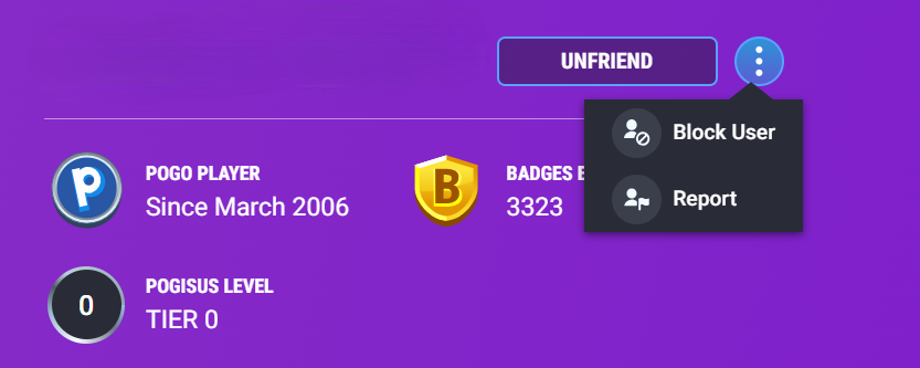 3. Reporting through Profiles: By viewing a player's profile page you will find the three dots again with an option to Block User or Report. Click on either one to begin the process for this option.