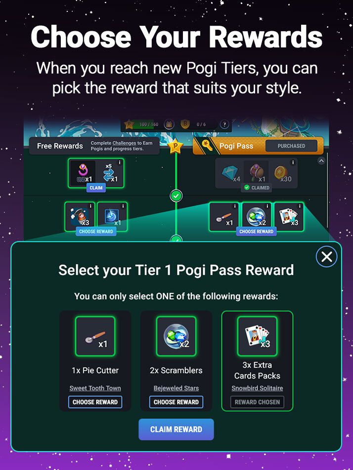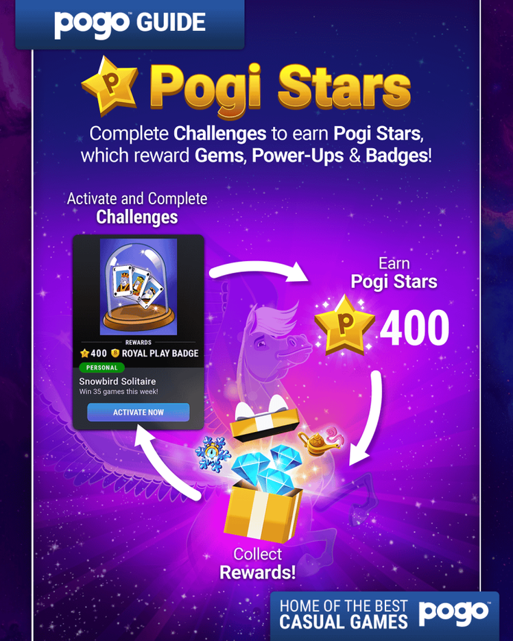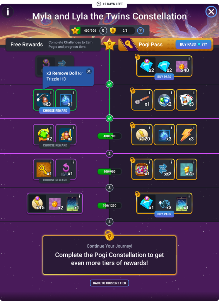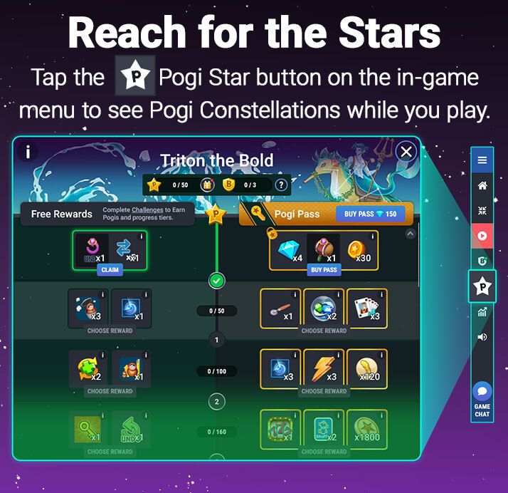 Think of it as your own personal path to rewards. Every Challenge you complete at Pogo awards Pogis. As you collect Pogis, you can earn various in-game rewards for each tier in the Pogi Constellation, as well as Gems!